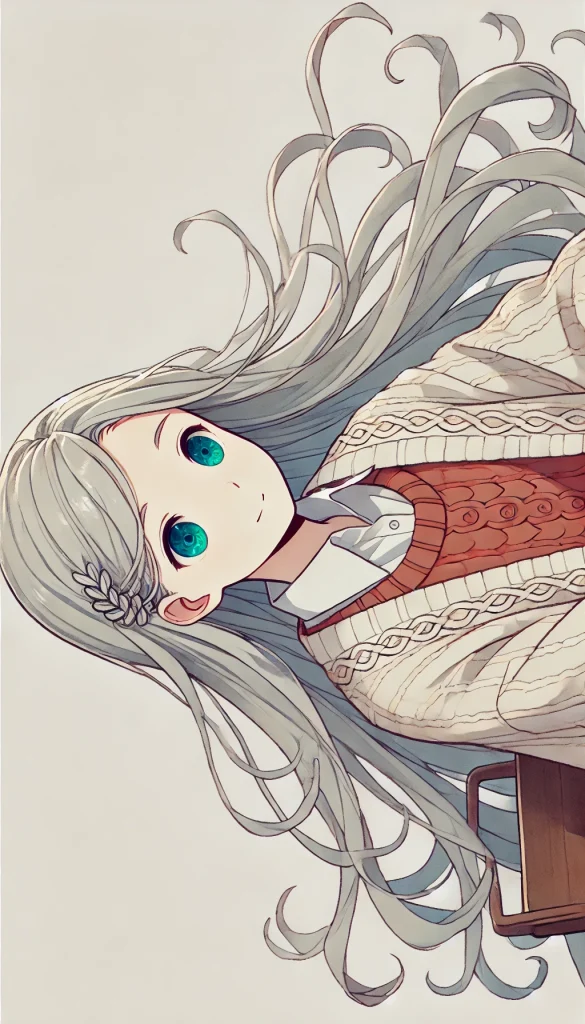 “A Japanese anime-style high school girl with silver hair. She has long, flowing silver hair and bright blue eyes. She wears a casual home outfit, consisting of a cozy sweater and skirt. Her expression is focused and thoughtful, typical of someone deeply engaged in creative work. The setting is not specified, so it will be a neutral background that emphasizes the character.”
